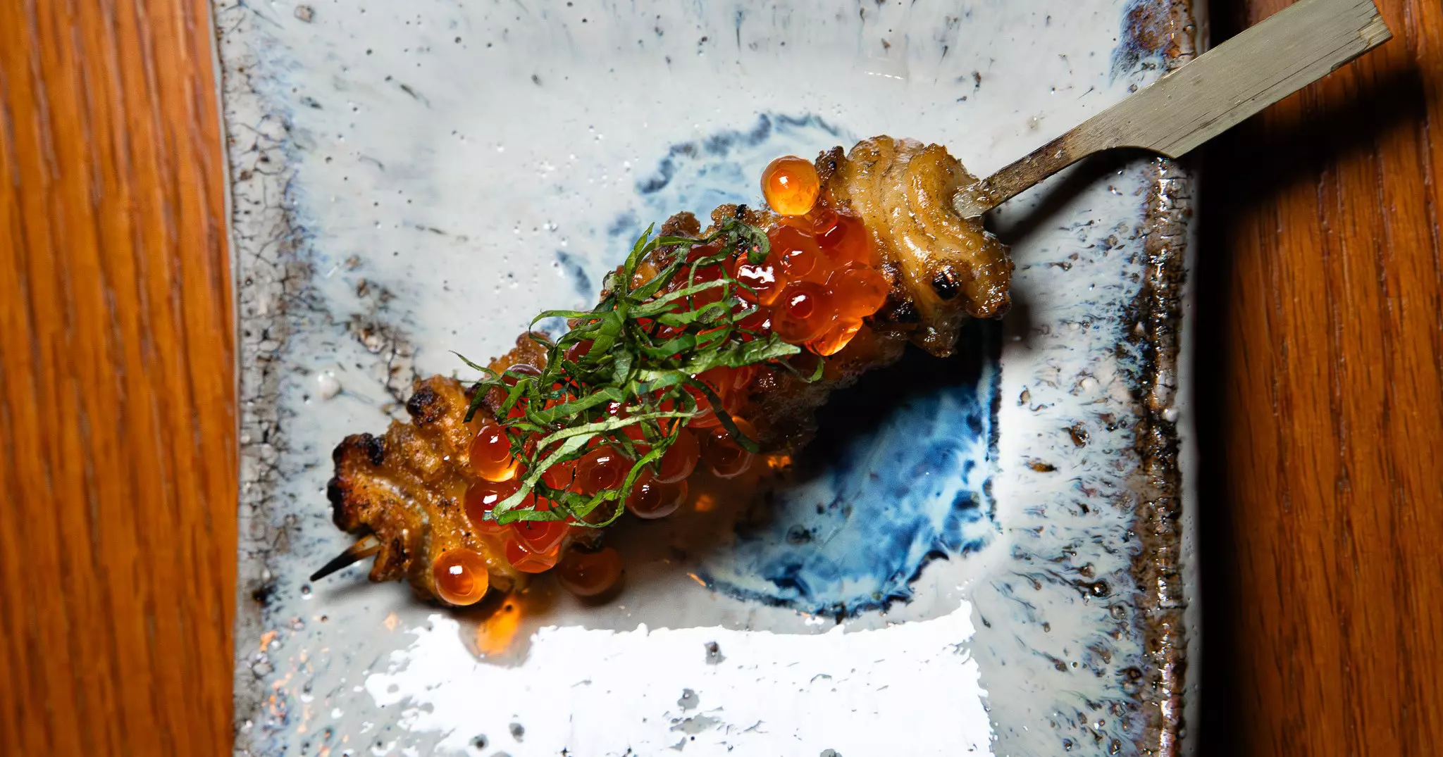 Lors d’un récent événement, le menu comprenait un okonomiyaki au crabe royal avec œufs de truite, des brochettes de cuisse de poulet grillées croustillantes saupoudrées de yuzu kosho, et un moriawase, une sélection du chef de nigiri.